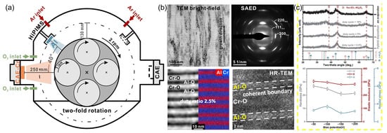 - Geng, D.; Xu, Y.X.; Wang, Q. Hybrid deposition of Cr–O/Al–O hard coatings combining cathodic arc evaporation and high power impulse magnetron sputtering. Surf. Coat. Technol. 2023, 456, 129235. [Google Scholar] [CrossRef]