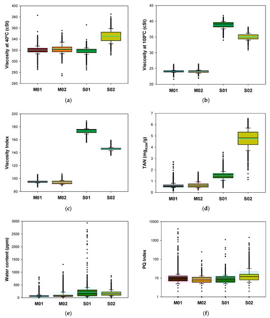 - In lubricant S02, only Ba had moderate correlations with several properties. Lower values of Ba were related to higher water content but with lower values of the PQ Index. Therefore, the presence of Ba containing additives may inhibit the water absorption tendency of the synthetic base in S02. Regarding the PQ Index, the positive correlation observed with Ba should be interpreted as an indirect effect. Ba also had a strong positive correlation with Cu (Table S4), another of the additives of S02 (Table 4). Although Ba, as a paramagnetic element, is not expected to influence PQ Index measurements, the high electrical conductivity and diamagnetic nature of Cu may affect these measurements, leading to increased registered values. The statistical analysis of the S02 dataset revealed some interesting aspects of the complex tribochemical interactions that characterize this kind of lubricants, as will be analyzed below.