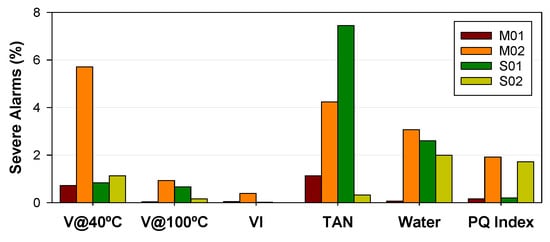 - The mineral lubricant with a moderate content of additives (M01) was the most used lubricant. This type of lubricants is mainly affected by the presence of Fe, with no significant correlations observed between additive or other contaminants elements and the lubricant parameters. Parameters such as PQ Index and TAN proved to be reliable indicators of lubricant oxidation. When mineral lubricants with higher additive content were used (M02), operational instabilities were reflected in a greater number of alarms related to lubricant parameters and Fe content.