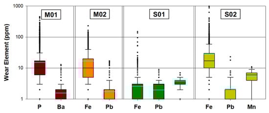 - Section 3.2, after the reduction in variables obtained by PCA, shows the analysis of trends, distribution of data and average values for lubricant parameters and main elements. Boxplots charts are used for this purpose. Bar plots are included to compare the tendency of different lubricants to reach values beyond the recommended limits.