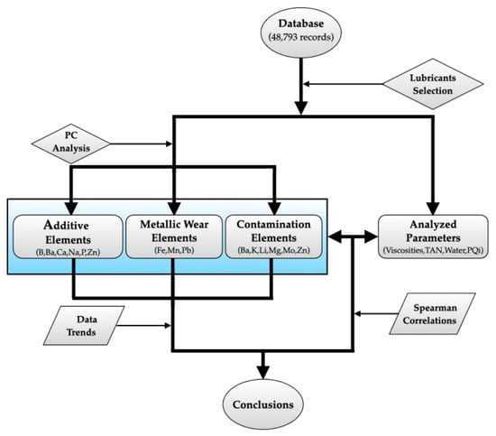 - Section 3.1 shows the PCA reduction in variables and correlation analysis. The results for the elements considered additives, metallic wear elements or contaminants are discussed separately. After the determination of principal components (PC), relationships between the main elements of these components and the lubricant parameters are determined, allowing us to perform an easier analysis with minimal loss of information.