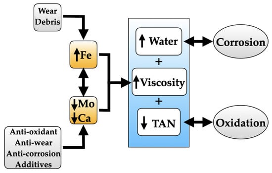 - The PCA of S02 did not identify Fe as a major contributor to the dataset variation, although strong correlations between this element and lubricant parameters are evident in Table 8. Higher Fe contents were related to higher values of viscosity and water contamination. Unlike mineral oils, higher Fe contents were associated with lower TAN values. As will be discussed later, in lubricants with high additives content, higher TAN values should not be attributed solely to acidification caused by oxidation, but rather to higher presence of additives in the samples. In S02, Fe content also correlated to lower contents of Mo and Ca additives (Table S4). This suggests that the negative relationship between Fe and TAN may be considered an indirect effect of the depletion of additives that are consumed during the formation of protective films. In other words, corrosion and oxidation processes of this lubricant did not manifest as higher TAN values, as observed in mineral oils. Instead, corrosion and oxidation processes were reflected in lower contents of specific additives and higher water contents. A schematic representation of the proposed degradation mechanism for this lubricant is provided in Scheme 2.