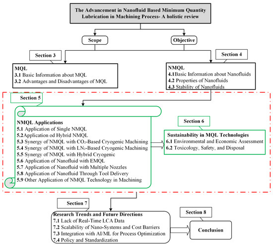 The scope goes beyond performance research to include a critical look at the technology’s wider effects. This consists of a complete LCA of the environmental and economic viability, as well as an essential consideration of the toxicity, safety, and disposal problems that come with nanomaterials. Lastly, the article talks about the gaps in present research and suggests future approaches. It investigates how artificial intelligence could be used to improve processes and the urgent need for strong regulatory standards. The review is limited to published academic and industrial research. Its goal is to provide a comprehensive and forward-looking overview of the current state of nanofluid-assisted machining. Figure 1 shows the framework of this research.