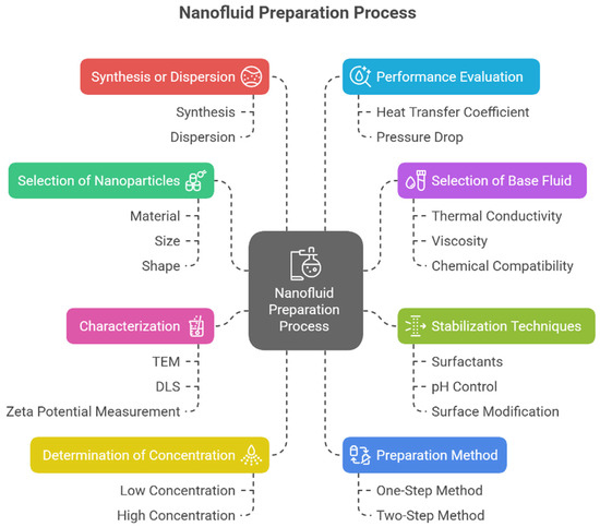 As defined before, nanofluids are a customized mixture of nanoparticles and base fluids; the thermal and physical properties of the mixtures change according to the area of application. Before fabricating the nanofluid, it is vital to study the individual properties of the base fluid and nanoparticles. Suppose the nanoparticles used to fabricate the nanofluid do not enhance the properties of the nanofluid as compared to the base fluid. In that case, such a nanofluid is useless in most applications. So, the basic principle of fabricating a nanofluid must fulfill the rule, i.e., combining two different things to an enhanced effect which should be greater than the sum of the two individuals. Nanofluids can be made by mixing nanoparticles of different families, such as carbides (TiC), oxides (Al2O3, CuO), semiconductors (SiC), nitrides (ALN, SiN), metals (Au, Ag, Cu), graphene, and carbon nanotubes. Each of the nanofillers has its own distinct benefits. Oxide-based nanofillers, such as aluminum oxide (Al2O3), silicon dioxide (SiO2), and zinc oxide (ZnO), are known for their high thermal conductivity and hardness, which enable them to act as effective heat sinks and mild abrasives that polish the workpiece surface. Carbide-based nanofillers, notably silicon carbide (SiC), are extremely hard and provide exceptional anti-wear and anti-friction properties, helping to extend tool life and improve surface quality. Nitrides, such as hexagonal boron nitride (hBN) and titanium nitride (TiN), are a class of ceramic nanofillers recognized for their outstanding thermal stability, hardness, and lubricity, which are crucial for high-temperature machining applications. Metal nanofillers, including silver (Ag) and copper (Cu), are excellent heat conductors, significantly enhancing the cooling capabilities of the nanofluid which helps in dissipating the heat from the cutting zone [11]. Finally, carbon-based nanofillers, a category that includes graphene and carbon nanotubes (CNTs), are among the most effective for MQL systems due to their superior self-lubricating properties [12], which minimize friction and wear, and their high thermal conductivity, which efficiently dissipates heat, leading to lower cutting forces and a better surface finish [13]. Also, mixing carbon-based nanoparticles into base dielectric fluid yields a notable reduction in surface crack density [14]. In addition, some non-metallic and other recently developed materials are also the best candidates for nanofluids according to the desired application. Similarly, the most commonly used base fluids in machining applications are water (H2O) and ethylene glycol. However, some vegetable oils such as sunflower oil and blasar cutting oils have also been used by many researchers. In the past, micro-sized particles were used; however, later, to get enhanced properties, novel technology based on nanoparticles evolved. At the end of the 20th century, Choi started work on the classification and fabrication of new nanoparticle-based fluids and gave them the name “nanofluid” [15]. Different methods can make nanofluids, and there are different criteria to evaluate the performance of nanofluids. Recently, nanofluids have been used by many scientists in industrial and metal-processing applications to promote sustainability. In the machining process, nanofluids are applied with a customized or commercially available MQL system. The application of nanofluid in the machining process is a cost-effective, green, clean, and efficient method. In short, nanofluids are gaining fame in many applications as they produce better performance than normal heat transfer fluids (HTFs). Nanofluids are used in electronics, microdevices, chillers, refrigerators, machining, engines, oscillating pipes, heat exchangers, fuel cells, and many medical applications. Lastly, nanofluids can be classified into two major types, i.e., single and hybrid nanofluids. Nanofluid preparation is a complicated process. Figure 2 shows the preparation process for nanofluids.