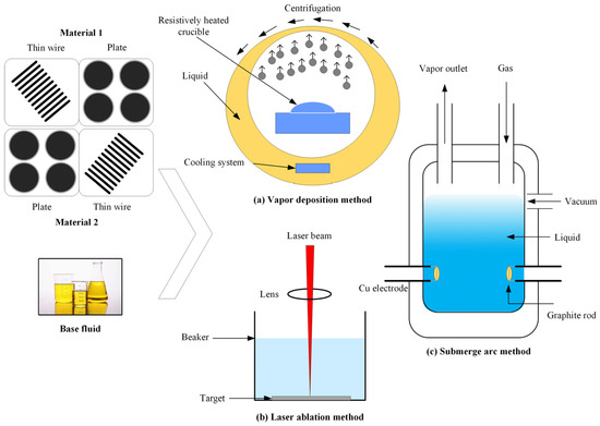 During this preparation process, the nanoparticles are mixed with base fluids and made into nanofluids. The preparation methods include one-step methods and a two-step method. Figure 3 shows a visual representation of one-step methods.