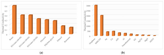 Enhanced thermal conductivity of nanofluids as compared to base fluids makes them an ideal choice for heat transfer applications. Lee et al. [16] prepared Al2O3-based nanofluids and observed a 1.44% increase in the thermal conductivity of the nanofluids when compared with base fluid. In another study, Chandrasekar et al. [17] found a maximum increase of 7.52% in the thermal conductivities of Al2O3/water when compared with base fluid. A linear relationship between thermal conductivity of concentration percentage and thermal conductivity was found. In the study of Paul et al. [18], it was noted that thermal conductivity of Al-Zn-based nanofluid highly depends upon the particle size, stability of dispersed nanoparticles, temperature, and concentration. With a percentage volume concentration of 0.1, a 16 percent enhancement in the thermal conductivity was observed. Yu et al. [19] prepared kerosene-based Fe3O4 nanofluids. The authors observed that increases in the concentration of nanoparticles can increase the thermal conductivity up to 34% which is more than the thermal conductivity of Fe3O4 alone. Figure 5 shows the thermal conductivity of nanofluids.