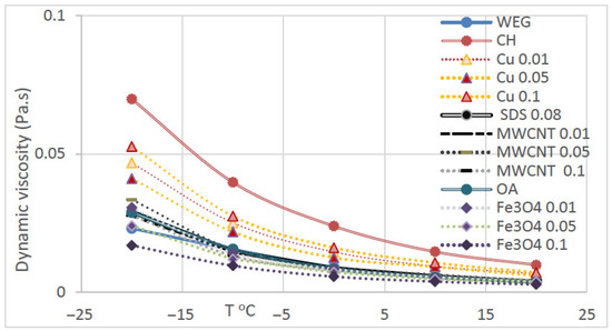 Experimental studies of the dynamic viscosity of stable water-based nanofluids containing ethylene glycol were conducted by Banisharif et al. [23]. Newtonian behavior is seen at all temperatures, excluding lower ranges, in the interval of −20 °C to 20 °C. No substantial increase in viscosity was observed for multi-walled carbon nanotube (MWCNT) nanofluids, which exhibit a reduction in viscosity with increasing nanoparticle concentration, while Cu and Fe3O4 nanofluids have a similar trend. Figure 6 shows the viscosity of nanofluids against temperature.