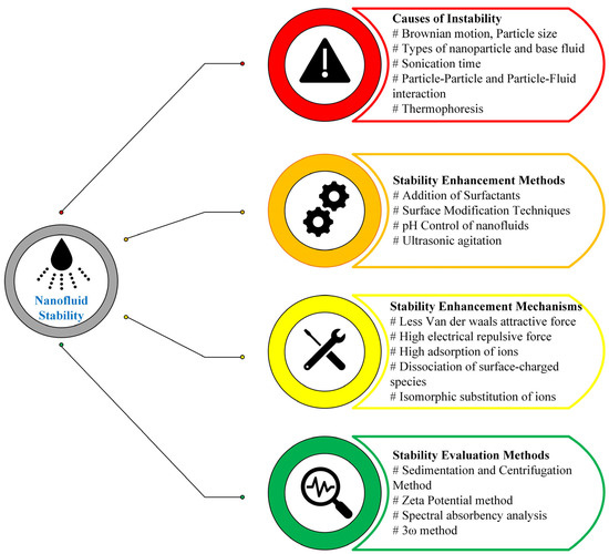 Unsuspended nanoparticles (NPs) promote agglomeration in nanofluids (NFs); hence, a stable nanofluid must have a proper NP suspension. Stabilization keeps NPs apart to prevent agglomeration. Surfactants are most often used to make stable NFs. Surfactants are polymers that reduce liquid surface tension and liquid–liquid and liquid–solid interfacial tension. Surfactants cover NPs to inhibit aggregation by creating steric repulsive forces. Chain–chain interaction of adsorbed surfactant tails creates a steric repulsive force that keeps surfactant-coated NPs apart in the medium. Aqueous polyaniline colloids demonstrate persistent dispersion by electrostatic repulsion in the absence of additives, facilitating environmentally friendly nanofluid processing [37]. The preceding research has examined NF synthesis, stability, thermophysical properties, and heat transport. Figure 7 shows the processes of finding out the stability of nanofluids.
