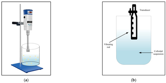 A colloidal suspension with good dispersion is a primary demand for stable nanofluids. In the physical treatment method, high energy is required to break clusters of NPs to form a well-dispersed colloidal suspension. The homogenization and ultrasonic agitation methods can achieve this. In the homogenization method, clusters of nanoparticles are broken using high-shear homogenizers, as shown in Figure 9a.