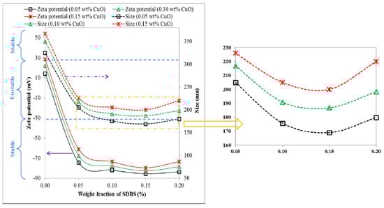 Effect of SDBS weight fraction on the zeta potential and particle size of CuO/water nanofluids (T = 298 K) [61].