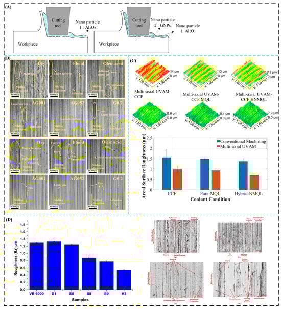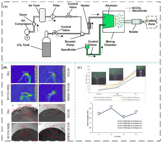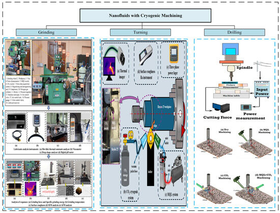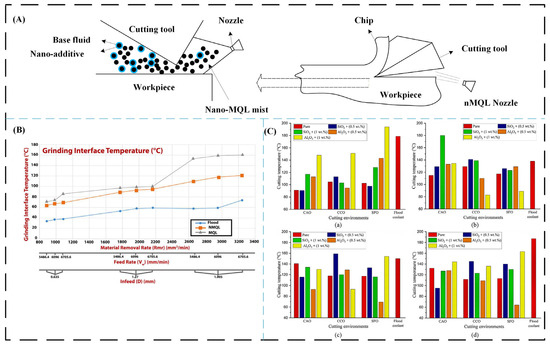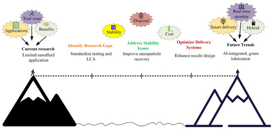 However, that was not the end of the changes in manufacturing. Different ways of improving manufacturing other than MQL have been explored by researchers in recent times [1,2]. Standard MQL has limitations in high-heat situations and when machining superalloys that are difficult to cut, necessitating a new level of innovation. This was made possible by nanotechnology, which led to the creation of “nanofluids.” They are manufactured colloidal suspensions of nanosized particles (such as oxides, carbides, or carbon nanotubes) in a base fluid. The primary objective of nanofluids is to enhance the thermophysical properties of the base fluid at a fundamental level, thereby increasing its thermal conductivity and lubricating capabilities beyond those of conventional liquids.