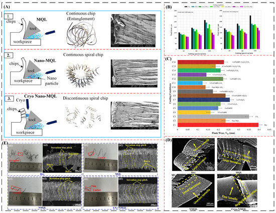 - Eltaggaz, A.; Ali, S.; Badwal, K.; Deiab, I. Influence of nanoparticle concentration in nanofluid MQL on cutting forces, tool wear, chip morphology when milling of Inconel 718. Int. J. Adv. Manuf. Technol. 2023, 129, 1787–1800. [Google Scholar] [CrossRef]
