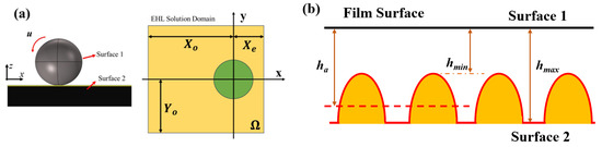 Schema of EHL model description. (a) Schematic diagram of point contact EHL solution domain, (b) diagram of surface film thickness. In (a), the yellow square denotes the EHL solution domain, while the green circle represents the Hertzian contact circle, where
