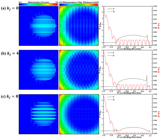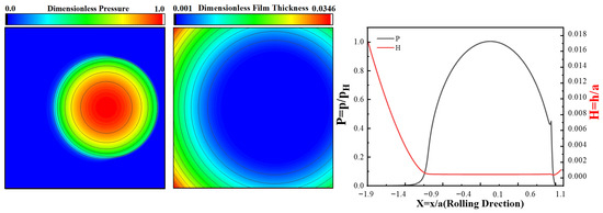 Prior to the analyses of textured surfaces, the lubricating state of the smooth surface under basic working conditions is given for reference. As shown in Figure 3, because the smooth surface contains no asperities and the hydrodynamic film generated by the entrainment effect is sufficient to fully sustain the load under the basic working conditions, a full-film EHL state is observed within the studied conditions. Here, the average film thickness