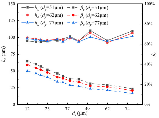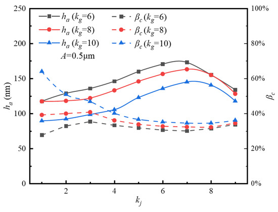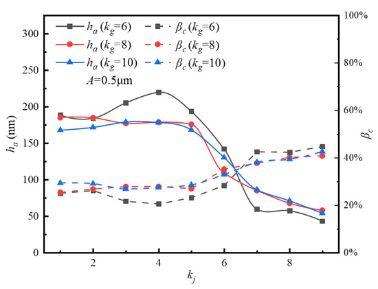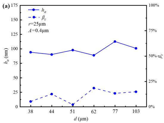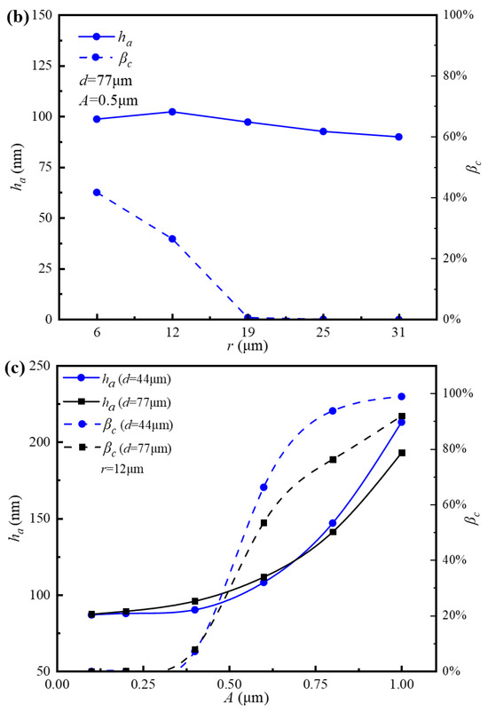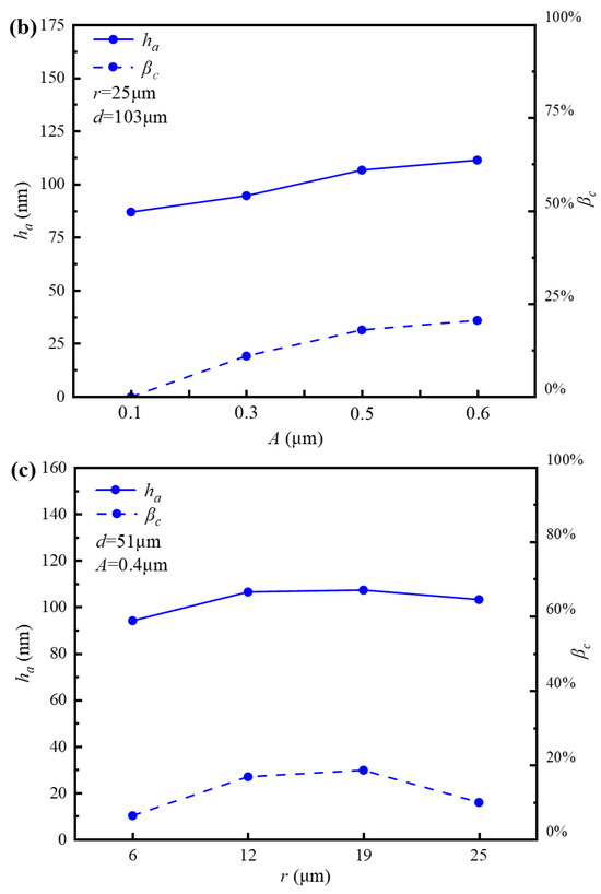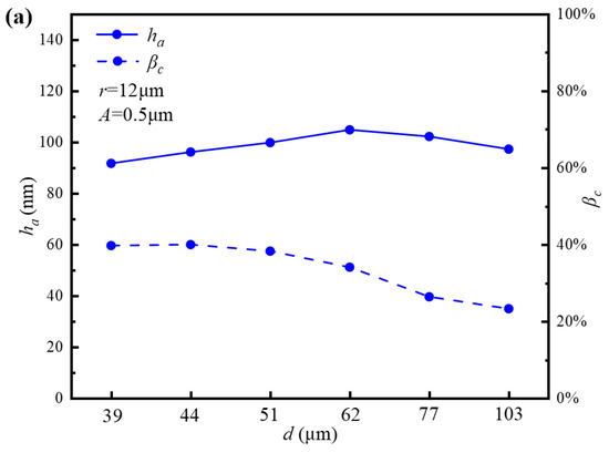 changes from 0% to 20%. The values seem irregular, but the trends of two curves are largely opposite. This is consistent with the common understanding of film thickness and asperity load ratio relationship, which stated that the greater the film thickness, the lower the probability of asperity contact. The irregularity in the film thickness variation may be due to partial bumps which may exist at the boundary of the Hertzian contact radius, which is the core region for calculating the oil film thickness. As shown in Figure 4b, increasing bump height