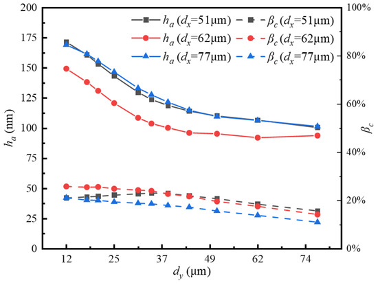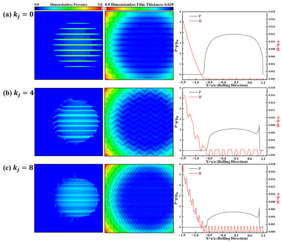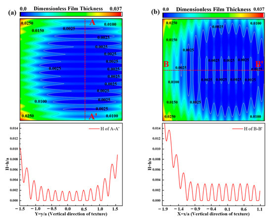 . The rough surfaces are directly digitized in the deterministic model, in which two arbitrary rough surfaces can run through the EHL conjunction at any rolling and relative sliding velocities. Here, to make it simple, a smooth surface 1 and a textured surface 2 are utilized, as demonstrated in Figure 2b, and both surfaces move at the same velocity, maintaining a state of pure rolling motion. The rolling direction is set to be consistent with the x-coordinate for the whole research. It is important to note that the average film thickness,