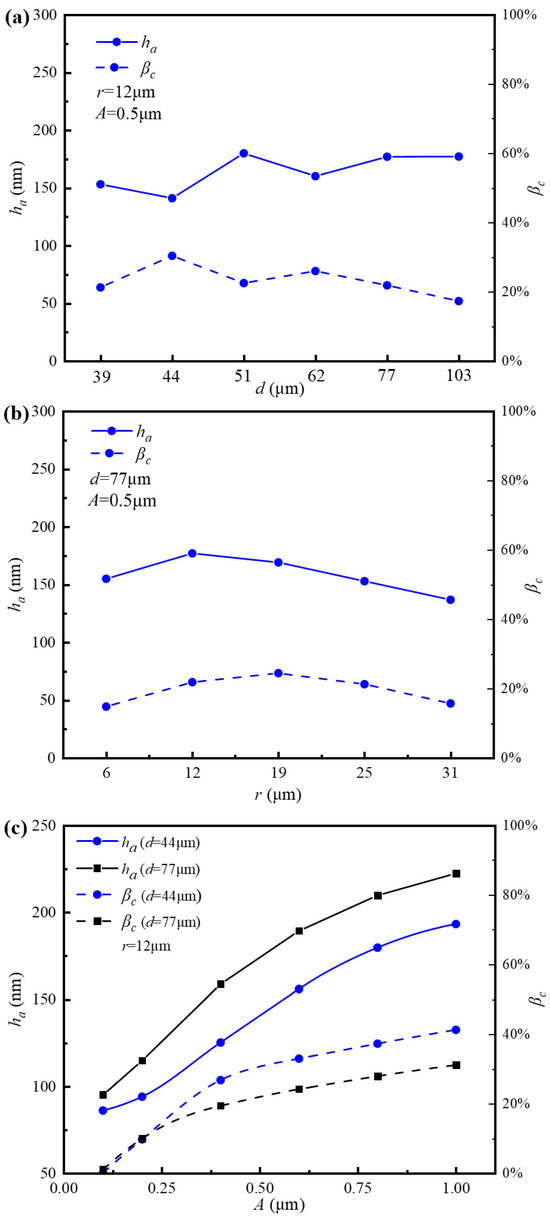 . Under the basic operating conditions as listed in Table 1, the Hertzian contact radius for smooth surfaces was 206 μm. Therefore, for bumps surfaces, the contact area can cover approximately several to several hundred bumps depending on their design parameters. For grooved surfaces, the contact area can cover 4 to 16 grooves, and the number depends on the spacing between the textures.