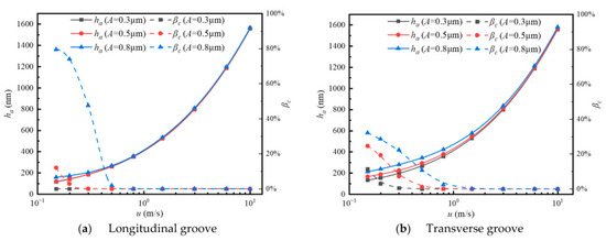 for transverse and longitudinal ridges with ridge heights of 0.3 μm, 0.5 μm, and 0.8 μm are presented in Figure 17. This study found that as the sliding velocity increases, the average film thickness