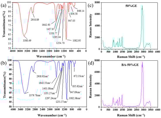 Infrared spectra of (a) 50%GE and (b) BA-50%GE mixed solutions, and Raman spectra of (c) 50%GE and (d) BA-50%GE mixed solutions.