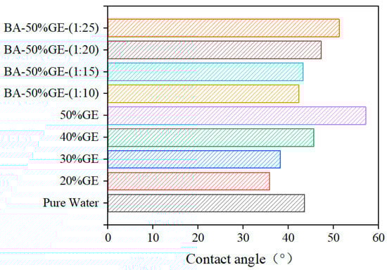The relationship between shear stress and shear rate of (a) 50%GE aqueous solution and (b) BA-50%GE-(1:25) aqueous solution at different temperatures; the variations in dynamic viscosity of (c) 50%GE solution and (d) BA-50%GE-(1:25) aqueous solution with shear rate at different temperatures. Contact angle measurements were performed to evaluate the wettability of pure water, GE aqueous solution at varying concentrations, and BA-50%GE mixtures with different ratios (Figure 3). The contact angle of GE aqueous solutions remained below 60°, regardless of the BA addition. However, increasing the concentration of GE influenced the adhesive force and surface wettability, likely due to enhanced molecular adsorption on the steel surface. Upon incorporation of boric acid, the contact angle of all mixed solutions was smaller than that of a 50%GE aqueous solution, indicating that BA enhances the wettability of the GE solution, possibly by modifying surface tension or improving molecular alignment at the interface.