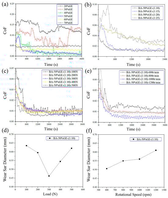 Variations in friction coefficient of (a) GE aqueous solution with different concentrations and (b) BA-50%GE mixed solution with different proportions; Variations in (c) friction coefficient and (d) wear diameter of BA-50%GE-(1:10) mixed solutions under various loads; Variations in (e) friction coefficient and (f) wear diameter of BA-50%GE-(1:10) mixed solution at different rotational speeds.
