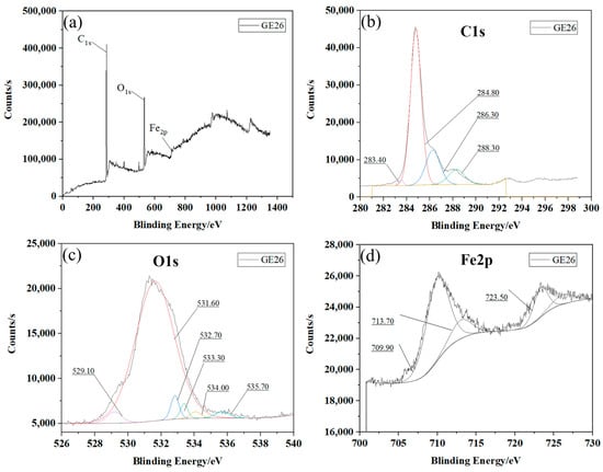 (a) XPS binding energy spectrum of the worn surface of the steel ball following the GE aqueous solution test; XPS binding energy spectrum fitting curve of (b) C1s, (c) O1s and (d) Fe2p on the worn surface of the steel ball.