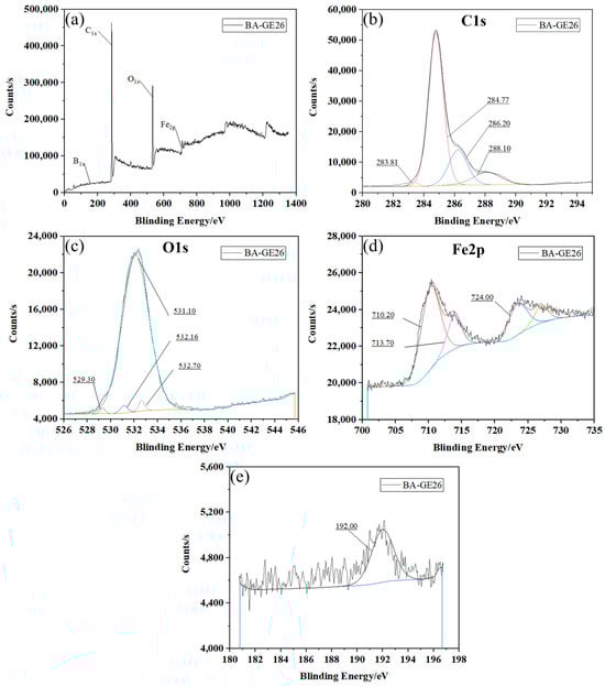 (a) XPS binding energy spectrum of BA-GE mixed solution; XPS energy spectrum fitting curves of (b) C1s, (c) O1s, (d) Fe2p and (e) B1s on the worn surface of the steel ball.