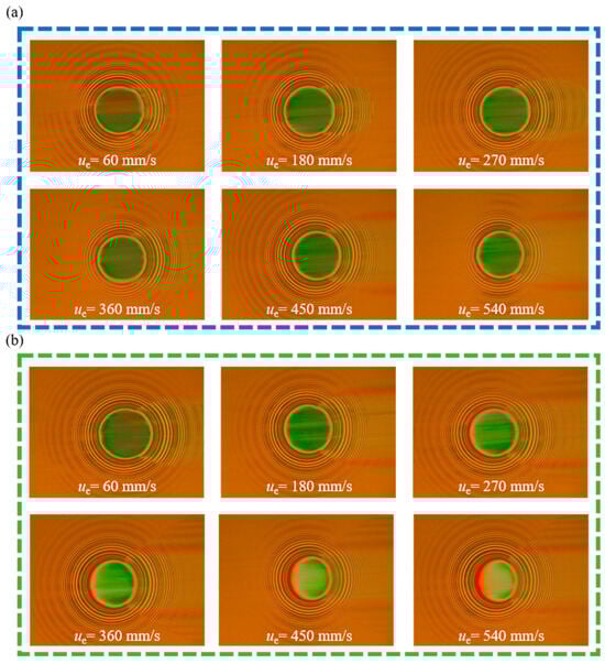 Figure 7 displays the interference patterns indicating the water film thickness for a 50% GE aqueous solution and a BA-50% GE mixture at different linear velocities. The left and right sides of the horizontal interference image represent the entrance and exit of the contact zone, respectively. The horizontal axis delineates the entrance and exits of the contact zone, illustrating how the lubricating water film’s thickness varies with linear velocity.