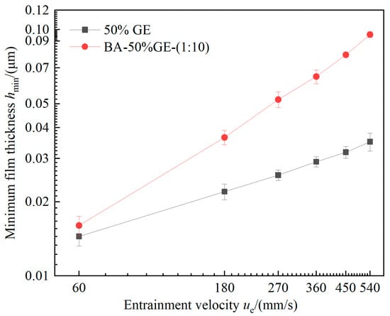 Variations in film thickness for 50%GE and BA-50%GE-(1:10) mixture at different entrainment velocities.