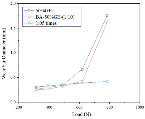 Figure 9 illustrates the relationship between the wear scar diameter and compensation diameter with 1.05 times for a 50%GE aqueous solution and a BA-50%GE-(1:10) mixed solution under various loads. The wear scar diameter of the BA-50%GE mixed solution is smaller than that of the 50% GE aqueous solution at the same load, indicating that adding BA enhances the anti-friction and anti-wear properties of the GE lubricant. Additionally, the maximum non-seizure load for the 50%GE aqueous solution is 496 N, which increases to 558 N with the addition of BA, resulting in a 12.5% improvement in the extreme pressure performance of the water-based lubricant.