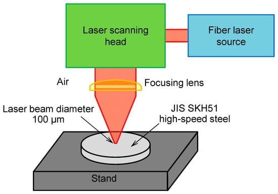 A nanosecond pulsed laser (YLP-1-100, IPG Laser GmbH & Co. KG, Burbach, Germany) with a wavelength of 1064 nm was employed to fabricate micro-grooves on the surface of JIS SKH51 high-speed steel (also known as DIN 1.3343 or AISI M2). The mechanical properties and chemical compositions of the high-speed steel are listed in Table 1. Laser texturing was performed at a constant laser pulse duration τ of 100 ns and a repetition rate f of 100 kHz. The laser beam was directed and focused onto the surface of a high-speed steel workpiece using a galvanometer scanner equipped with an f-theta lens with a 100 mm focal length. Scanning was performed at a traverse speed of 10 mm/s. The laser beam distribution was Gaussian, and the focused beam diameter at 1/e2 intensity was 100 µm, as shown in Figure 1. This beam diameter was selected to generate grooves with an approximate width of 100 µm. The groove dimensions targeted in this study were based on prior research [,,,], which identified an aspect ratio of approximately 0.1 as optimal for micro-grooves, as it promotes effective lubricant retention, enhances lubrication and reduces friction between contacting surfaces. Segu et al. [] reported that textures with groove width of 100 µm and density of 10% enhanced lubricant and debris entrapment, generating additional hydrodynamic lift and reducing asperity contact. Therefore, groove width and depth of 100 µm and approximately 10 µm (aspect ratio ≈ 0.1), respectively, were selected as the design targets. To achieve this depth, a series of preliminary experiments was conducted to determine the appropriate average laser power (P). Prior to laser texturing, the surfaces of the high-speed steel samples were cleaned with methanol to remove any contaminants. Through trial testing, it was found that using an average laser power in the range of 10–25 W and varying the number of passes from 1 to 3 allowed for the successful fabrication of micro-grooves with the expected width and depth. The laser parameters used for texturing are presented in Table 2.