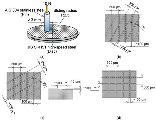 (a) Schematic diagram of friction test with pin-on-disc configuration, micro-grooves with crosshatch angles of (b) 30°, (c) 60° and (d) 90°.