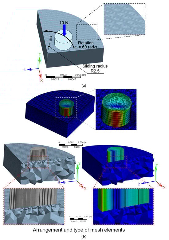 After the disc and pin geometries were defined and their material properties were established, the following boundary and loading conditions were configured for the finite element model. The simulation was performed in two sequential steps. In the first step, the pin was vertically pressed against the disc with a constant normal load of 10 N applied downward to the top surface of the cylindrical pin, as shown in Figure 3a. In the second step, the relative sliding motion between the pin and disc was simulated. Although in the experimental configuration, the disc was rotated while the pin remained stationary, the numerical model was designed such that the disc remained fixed and the pin was rotated instead. This approach not only preserved the same relative motion between the contacting surfaces but also reduced the computational time by limiting the number of moving elements []. The pin was rotated around the disc center at a constant angular velocity of 60 rad/s, corresponding to a linear sliding speed of 150 mm/s at a radial distance of 2.5 mm from the center. The following boundary conditions were applied: