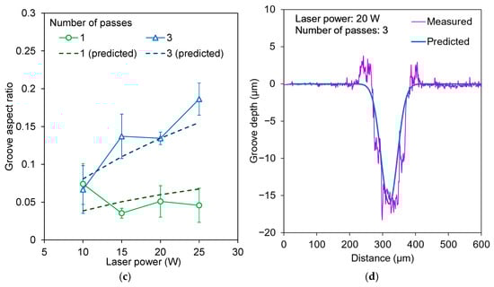 Effect of laser power and number of passes on (a) width, (b) depth, (c) aspect ratio of micro-grooves; (d) groove profile.