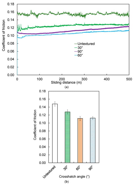 The friction coefficients for laser-textured surfaces with different crosshatch angles, and for a smooth, untextured surface across various sliding distances are presented in Figure 5a. During the initial stage of testing, all the surfaces exhibited a rapid increase in the friction coefficients. The surface with a 90° crosshatch angle showed a decrease in friction as the sliding distance extended to approximately 50 m. After this distance, the friction coefficient for the 90° crosshatch-textured surface began to rise again. The textured surfaces with 30° and 60° crosshatch angles exhibited a gradual increase in the friction coefficients, whereas the untextured surface continued to exhibit high and fluctuating friction levels throughout the test. Across all sliding distances, the textured surfaces exhibited consistently lower friction than the untextured surfaces. This observation suggests that the presence of micro-grooves contributes to enhanced lubricant retention on the surface [,]. The retained lubricant is crucial for maintaining a stable lubricating film at the contact interface, in contrast to a smooth surface, which is less capable of sustaining such a film. Furthermore, the flow of lubricant through the textured surfaces induces localized hydrodynamic pressure, which improves the load-carrying capacity between the contact surfaces and further reduces friction [,].