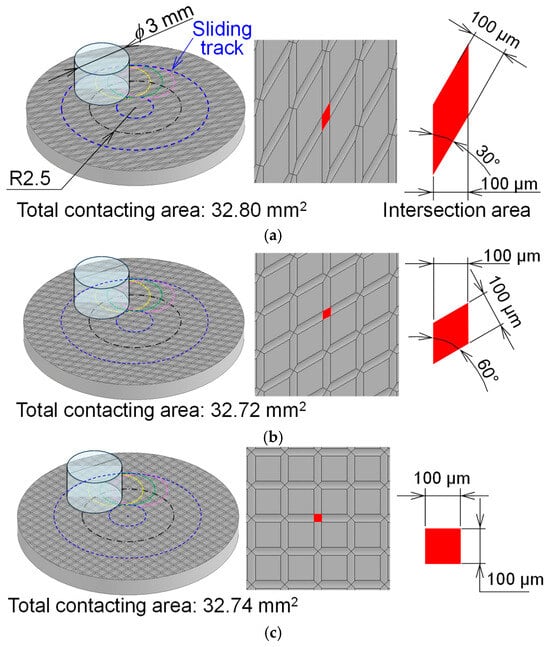 Schematic illustrations of the contact interface between the cylindrical pin with 3 mm diameter and laser-textured disc surface, showing distribution of flat contact area and micro-groove regions with different crosshatch angles: (a) 30°, (b) 60° and (c) 90°, and simulated total contact area between the pin and textured surface along a circular sliding path, positioned at a radius of 2.5 mm from the disc’s center.