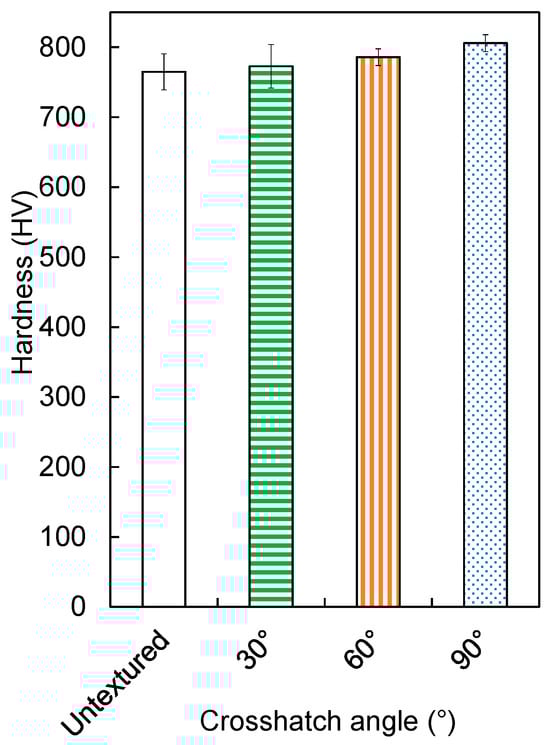 The microhardness values measured near the groove edges of the laser-textured surfaces are shown in Figure 7. Although the average coefficients of friction varied among the surfaces textured with groove crosshatch angles of 30°, 60°, and 90°, the surface hardness values of all textured samples were only slightly higher than that of the untextured surface. This indicates that the increase in surface hardness due to laser texturing was minimal and had a negligible effect on friction reduction. Therefore, in this study, the variation in frictional behavior was primarily attributed to the orientation of the groove crosshatch angle rather than changes in surface hardness.