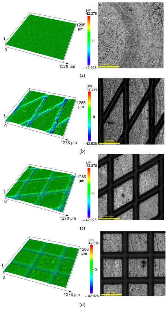 Following the friction tests, the worn surfaces of the samples were examined using a 3-D laser confocal microscope and an optical microscope to evaluate wear, as illustrated in Figure 8. The observations revealed no significant material loss in the sliding direction on any of the tested surfaces. Only slight surface scratches were observed, which corresponded to abrasive wear. These scratches were attributed to the interaction between the AISI 304 stainless steel pin and the test sample, as well as the presence of loose debris generated during sliding, particularly recast particles located within the grooves. These recast particles, often composed of hard oxide phases, can act as third-body abrasives, contributing to superficial scratching on the textured surface during the pin-on-disc test. The wear features observed were similar across all four surface conditions, regardless of the groove orientation.