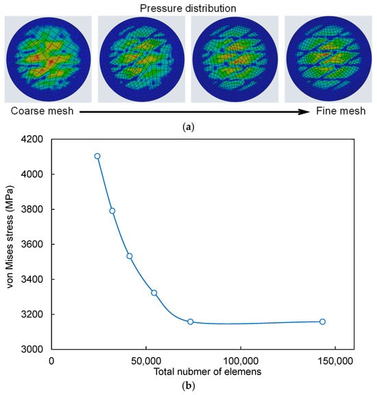 Figure 9a shows the effect of mesh refinement on the pressure distribution, clearly demonstrating enhanced resolution and sharper pressure gradients with finer meshes. Figure 9b presents the trend of von Mises stress versus the total number of elements, showing a clear convergence behavior of the stress with mesh elements of 73,425 or greater. Thus, it is suggested that simulations with mesh densities equal to or greater than 73,425 elements provide results that are independent of the mesh resolution, with an acceptable balance between computational efficiency and accuracy. This mesh sensitivity analysis validated the reliability of the finite element model in predicting contact-induced stresses and allowed for an accurate evaluation of stress concentrations near textured groove features. Accordingly, a mesh with 73,425 elements was adopted for all subsequent simulations in this study.