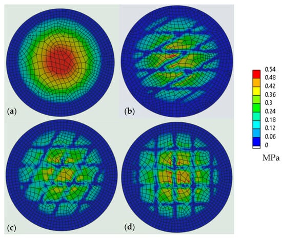 The numerical analysis revealed the distribution of the contact pressure on the disc surface reflected over the pin surfaces during the initial pressing phase (time step 1), as shown in Figure 10. Comparisons were made between untextured and laser-textured discs with groove crosshatch angles of 30°, 60°, and 90°. For the untextured disc (Figure 10a), the contact pressure distribution was nearly uniform and exhibited a symmetrical and continuous pattern across the contact area. The maximum pressure (red zone, 0.54 MPa) was located at the central region of the pin–disc interface and gradually decreased toward the outer edge in a concentric manner. This distribution reflects full surface direct contact and the capability of fully direct centralized load transmission, where no micro-texture exists to redistribute the load.