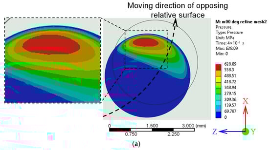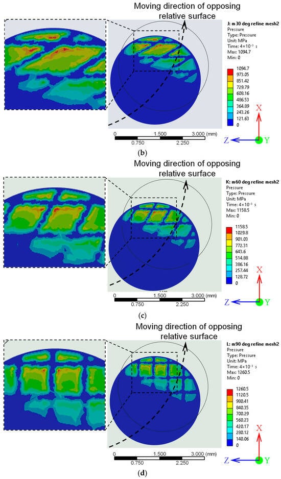 The 30° crosshatch pattern (Figure 11b) produced moderately localized high-pressure zones, with the maximum value reaching ~1094.7 MPa, distributed along the oblique groove edges. The 60° configuration (Figure 11c) exhibits a greater degree of localization, with more clearly defined pressure peaks (~1158.5 MPa). The 90° crosshatch pattern (Figure 11d) demonstrates the most distinct grid-like arrangement of high-pressure zones, with pronounced peaks (~1260.5 MPa) concentrated at the groove corners, which is consistent with the symmetrical orthogonal groove layout.