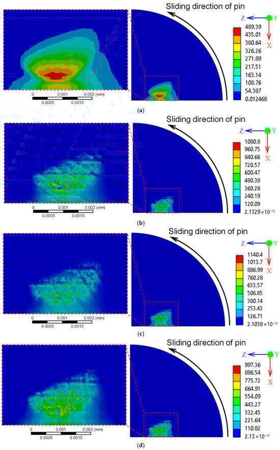 The corresponding von Mises stress distributions during the second phase of motion, when the pin slid relative to the disc, are shown in Figure 12. In all cases, the highest stress intensities occurred at the trailing edge of the contact interface between the pin and the disc. The untextured disc (Figure 12a) exhibited the lowest maximum von Mises stress, which was concentrated near the backside of the contact area beneath the sliding path with a relatively uniform distribution. In contrast, the laser-textured discs (Figure 12b–d) displayed significantly higher localized stress peaks, particularly concentrated at the corners of the groove edges. This behavior aligns with the findings of Yuan et al. [] and Wang et al. [], who reported that sharp texture boundaries act as stress concentrators, amplifying von Mises stresses.