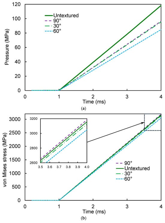 (a) Average pressure and (b) average von Mises stress over time for untextured and laser-textured discs with various groove crosshatch angles.