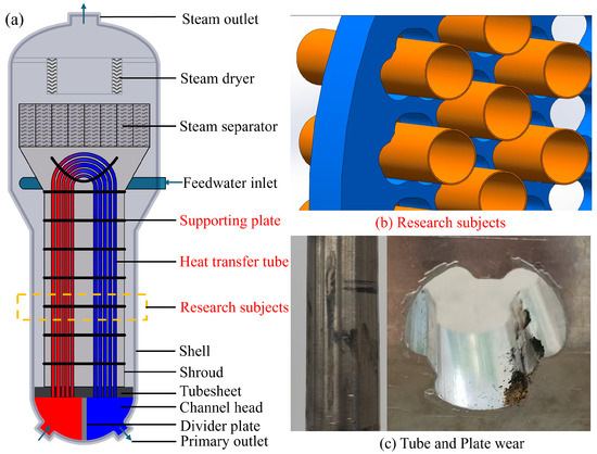 The nuclear steam generator is a critical component of pressurized water reactor (PWR) nuclear power plants, and its safe and reliable operation directly dictates the reactor’s overall efficiency and safety. Among various material options, Z10C13 ferritic stainless steel (DIN X10CrAl13, GB OCr13A1), owing to its excellent stress corrosion resistance and high-temperature strength, has been widely used in steam generator support plate structures [1]. To clearly illustrate the system under consideration, Figure 1 provides an overview of the steam generator, including the supporting plate, the heat transfer tubes, and their contact interface, which represents the critical research subject in this work. As shown in Figure 1b, flow-induced vibrations (FIV) during operation inevitably cause repeated micromotion at the support plate–tube interface [2,3]. Such micromotion leads to severe fretting wear manifested by material loss, wear debris generation, and debris accumulation at the contact interface [4,5]. Representative examples of plate wear and tube wear are also displayed in Figure 1b, visually demonstrating the extent of damage that can occur in service. This wear debris not only accumulates between the support plate hole walls and the tube outer surfaces, leading to localized blockage that impedes fluid flow and reduces heat transfer efficiency [6], but also alters the load path and structural stiffness, thereby amplifying vibration amplitude and contact impacts in a self-reinforcing deterioration loop. According to a survey conducted by Dow, approximately 60 pressurized water reactors (PWRs) units reported steam generator (SG) heat exchange tube leakage caused by fretting wear during 1992–1993 [7,8], highlighting the significance and urgency of research in this area.