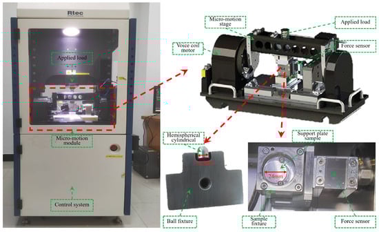The experiments were conducted on an Rtec MFT-5000 multi-function tribometer (Rtec Instruments, San Jose, CA, USA) comprising a coil driven loading mechanism, a high frequency piezoelectric force sensor, a precision spring loading unit, and a realtime data acquisition system. This setup can achieve high precision fretting loading at frequencies from 0.1 to 200 Hz, with the temperature maintained at 23–25 °C. The experiments were conducted using a classical ball-on-flat contact configuration. The specimen was a disc-shaped Z10C13 sample with a diameter of 24 mm and a thickness of 8 mm. Its surface was subjected to multi-stage metallographic polishing, resulting in a surface roughness of μm. An Inconel 690 Hemispheriçal cylindrical specimen was used as the upper component, featuring a spherical front end and a cylindrical rear section with a diameter of 6.5 mm. To ensure test repeatability and to avoid cross-contamination of wear debris, a new ball specimen was employed for each test. This configuration was designed to suppress rolling of the spherical surface under high frequency fretting motion, thereby ensuring stable contact and alignment during testing. The actual device and structure are illustrated in Figure 2.
