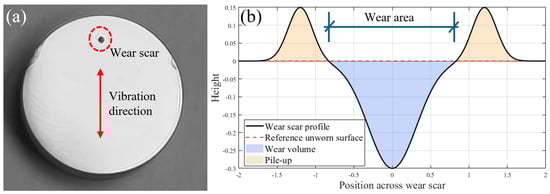 Schematic of wear surface determination. (a) Location of the wear scar and vibration direction on the specimen surface. (b) Representative wear profile taken along the vibration direction through the center of the scar. The black curve denotes the measured wear profile, the red dashed line indicates the reference unworn surface, the blue area corresponds to the depression (wear volume), and the orange area corresponds to the pile up.