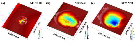 As shown in Figure 4, the selected representative cases highlight the systematic evolution of fretting damage with increasing load and amplitude. At the low-load/low-amplitude condition as Figure 4a, the wear scar remains shallow and relatively smooth, with regular edges and limited material removal. At the intermediate condition as Figure 4b, the scar enlarges and deepens, exhibiting a bowl-shaped profile with pronounced edge perturbations, reflecting the onset of fatigue-assisted wear mechanisms. At the high-load/high-amplitude condition as Figure 4c, the scar develops into a severely damaged region characterized by extensive central collapse, multi-scale spalling pits, and ridge-like pile-up at the periphery, indicating a substantial increase in both wear depth and surface roughness. Together, these representative cases illustrate the progressive transition from mild adhesive wear to severe fatigue spalling as the loading severity increases.