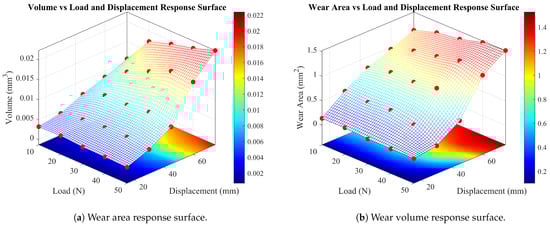 Response surfaces of wear area and wear volume as functions of normal load and displacement amplitude.