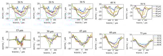 Profiles of wear scar cross sections under different (top) normal loads and (bottom) displacement amplitudes.