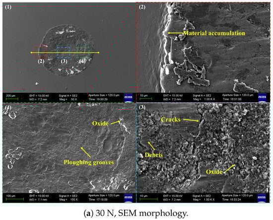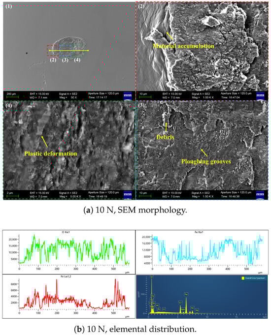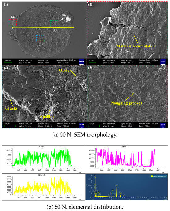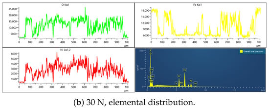 Figure 7, Figure 8 and Figure 9 show SEM micrographs and corresponding element distributions (EDS line scans for O, Fe, Ni) of wear scars at a fixed amplitude of 45 m under different normal loads. As load increases from 10 N to 30 N and then to 50 N, the dominant wear mechanism on the surface undergoes a significant transition from adhesive wear to fatigue spalling. Three magnified regions (left, middle, right) are indicated for each sample to display the spatial differences in material removal, and the right side presents line-scan distributions of O, Fe, and Ni along the yellow line in the SEM images.